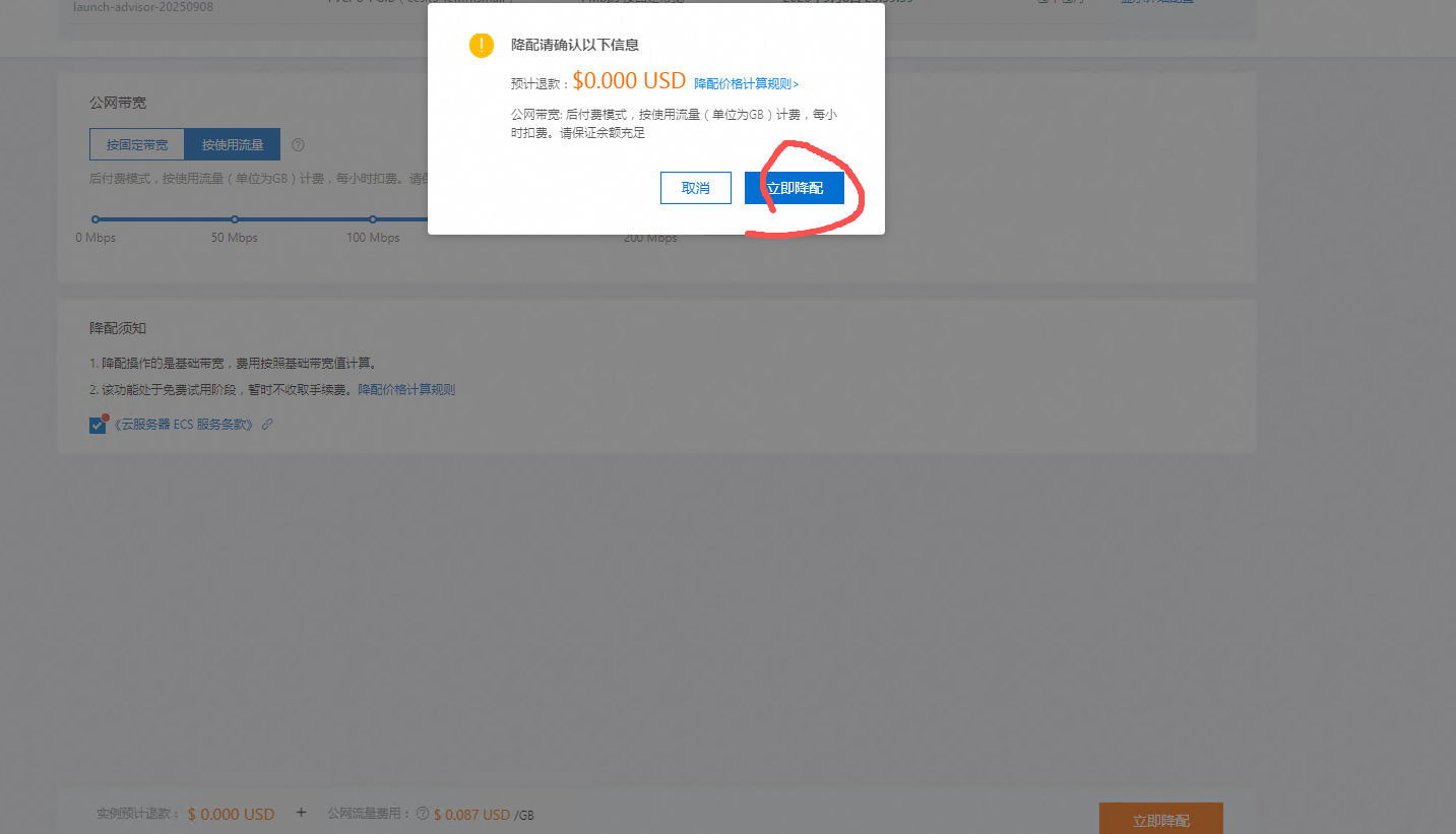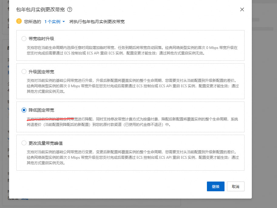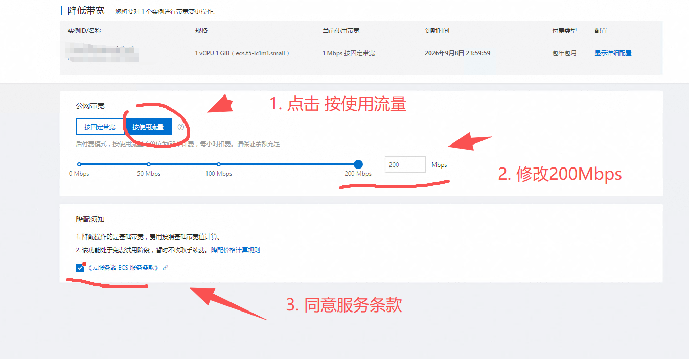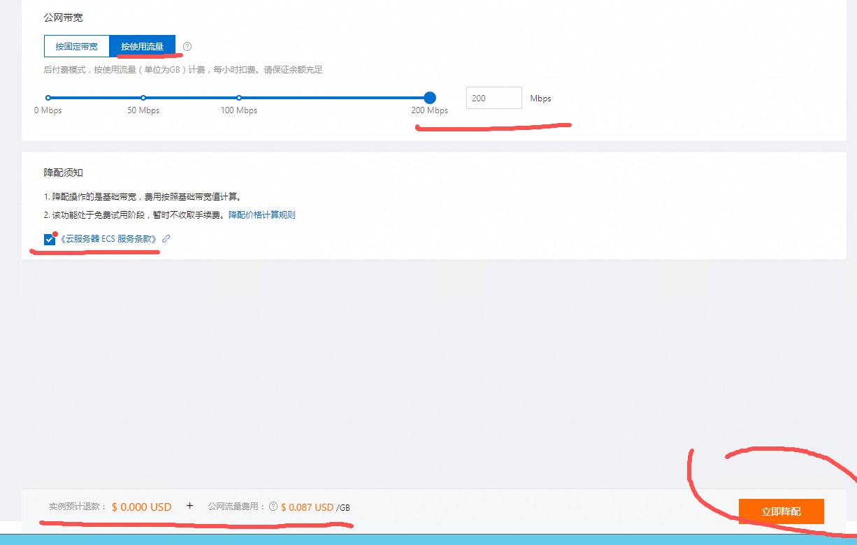 选择降低固定带宽,选择按流量计费,带宽拉到200Mbps即可